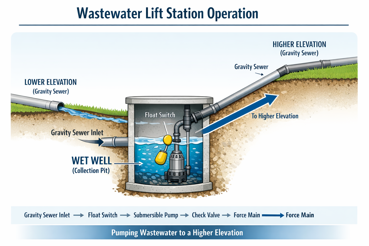 - Lift Stations main functions are to lift the wastewater from a lower elevation to a higher elevation, overcoming the differences in elevation and enabling the continuous flow towards the treatment facility. Our lift stations are equipped with robust pumps that are capable of handling large volumes of wastewater.